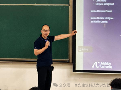 在升学规划板块,Ethan受邀对“4+N”赴澳出国留学项目政策进行解读。他从阿德莱德大学的地理位置、校园规模切入,系统介绍了该校的重点学术平台,重点阐述其QS排名优势及面向我院学生的专属福利,并明确了“4+N”项目的入学要求与学术标准,为有意向赴澳深造的学生提供清晰指引。